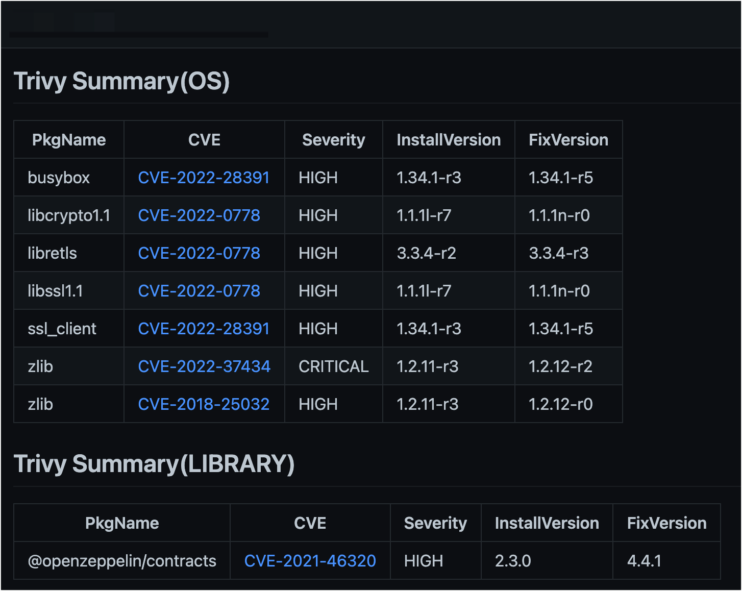 그리고 image 취약점 점검을 하고 이를 github action 하단에 summary를 보여준다.