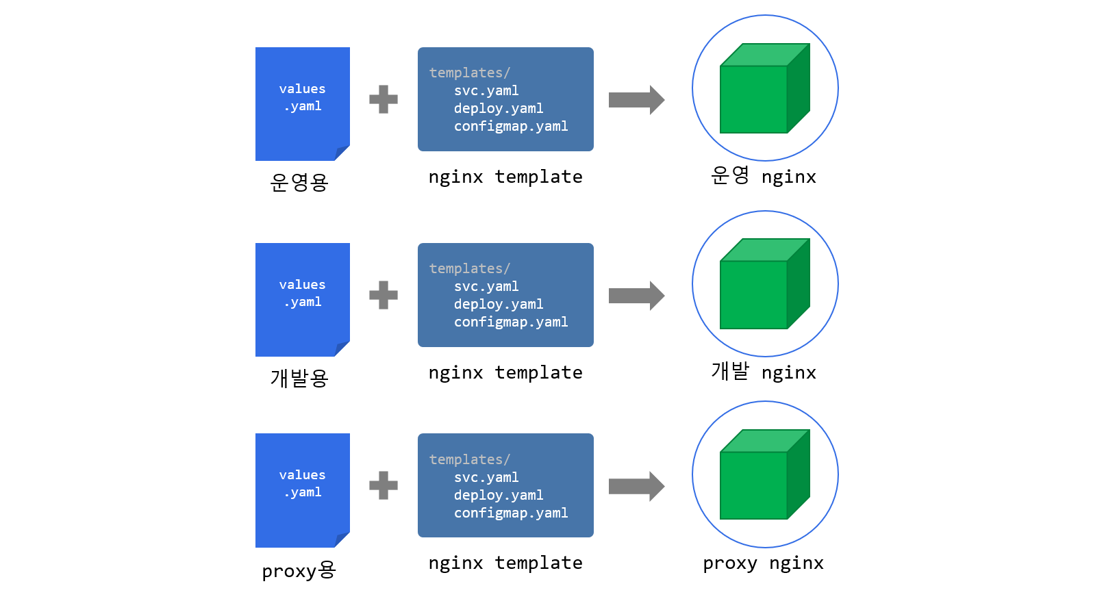 - 그렇기에 각 환경마다 templates를 수정하지 않고 values.yaml만 수정하여 다양한 환경을 만들 수 있다.