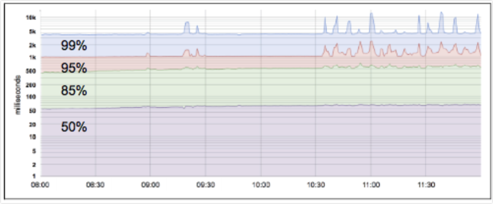 일반적인 요청은 대부분 50ms 응답 시간을 가진다. 하지만 느린 응답 시간 즉, 99 또는 95%에 해당하는 응답 시간은 일반적인 요청 대비 매우 느린 속도(5s)이다. 그리고 일반적으로 문제가 되는 것은 99%와 같은 구간에 속도는 응답 시간이 문제가 된다.