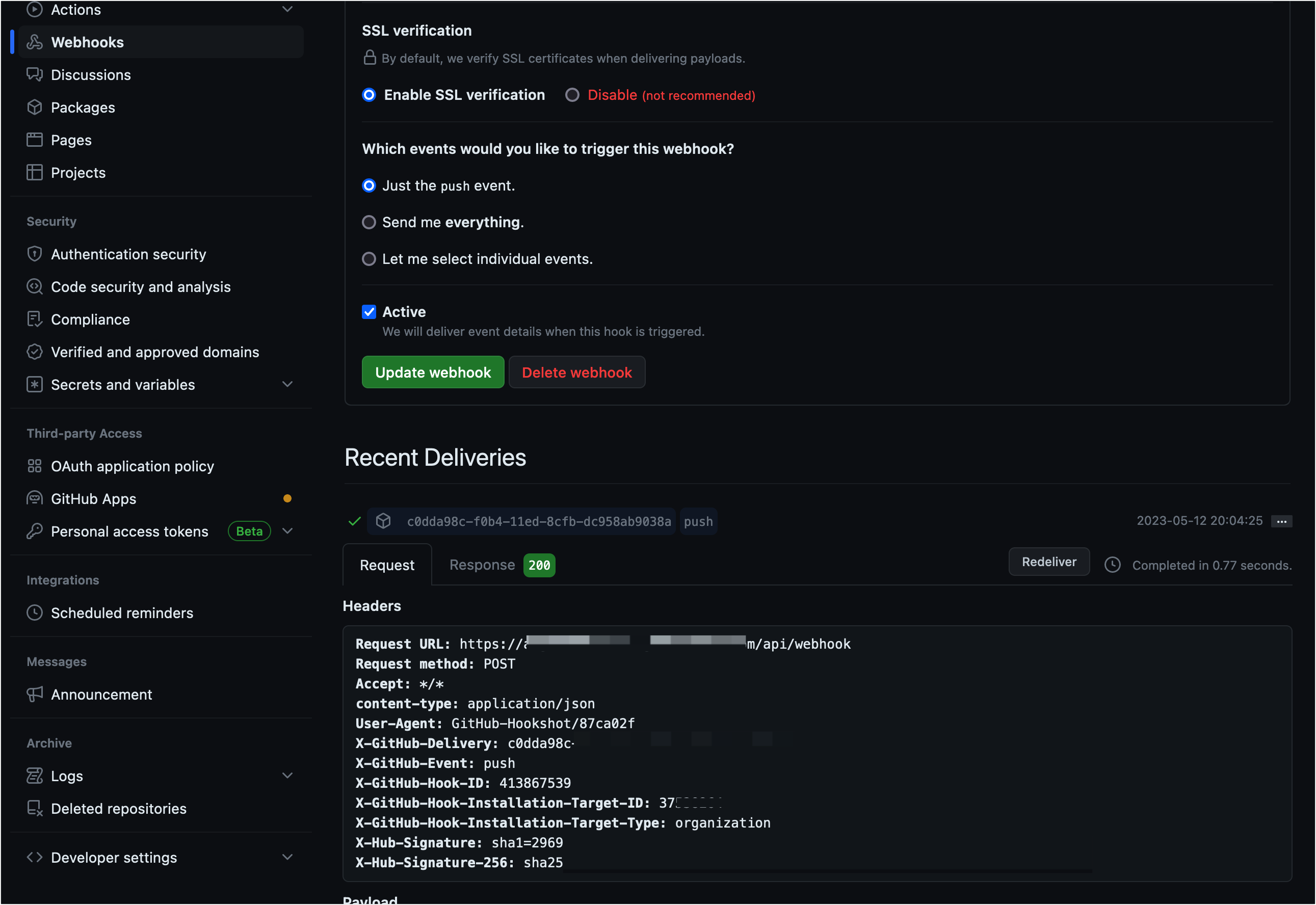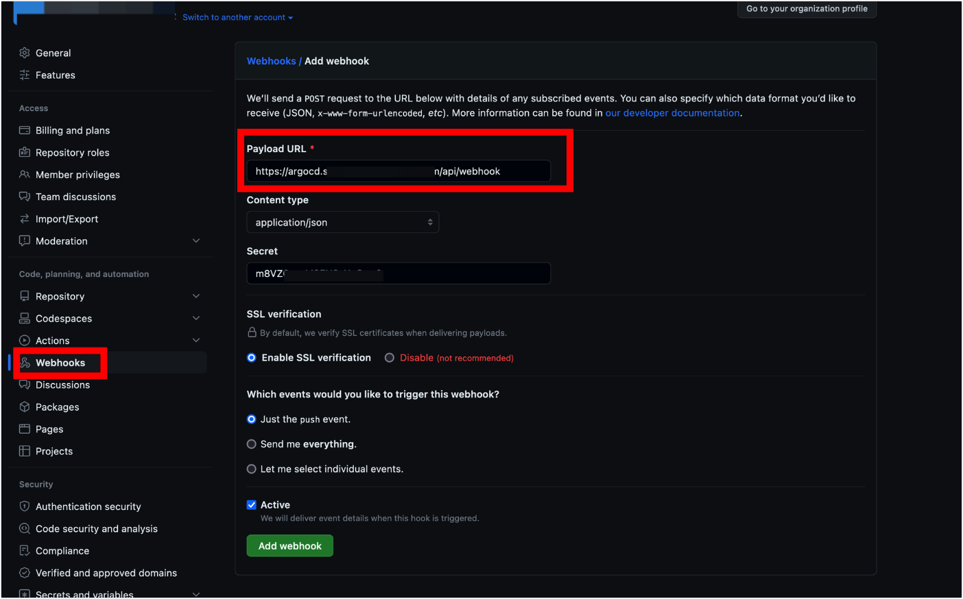 - 각 Repo별로 설정할 수도 있지만, 그러면 ArgoCD에 연동하는 모든 Repo에 설정해야 하므로 편의상 Org로 1개만 설정한다.