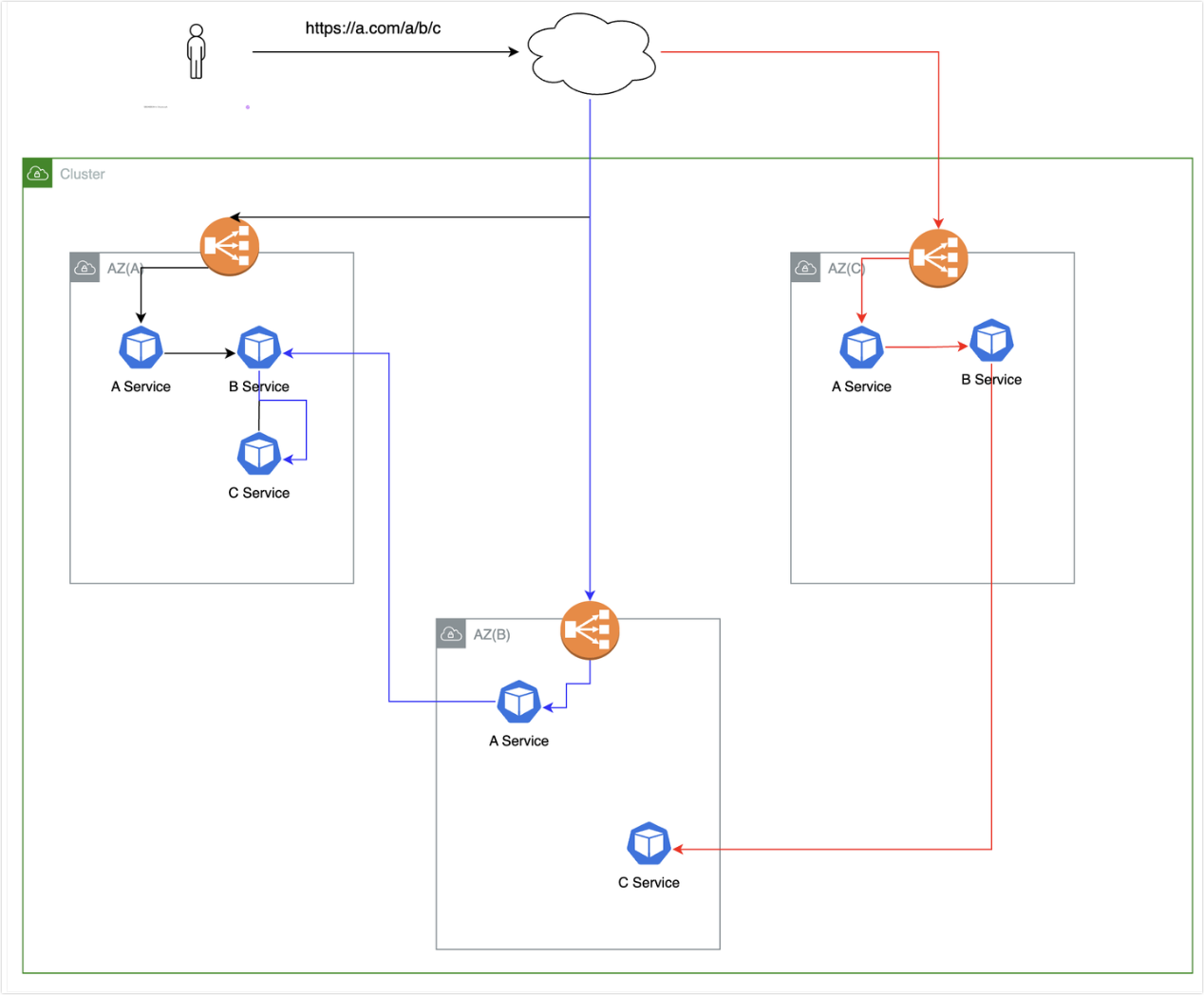 - 시나리오 1) A, B, C 서비스가 모두 동일한 Zone에 위치에 있다. (위 그림에서는 A Zone, 검은색 선)