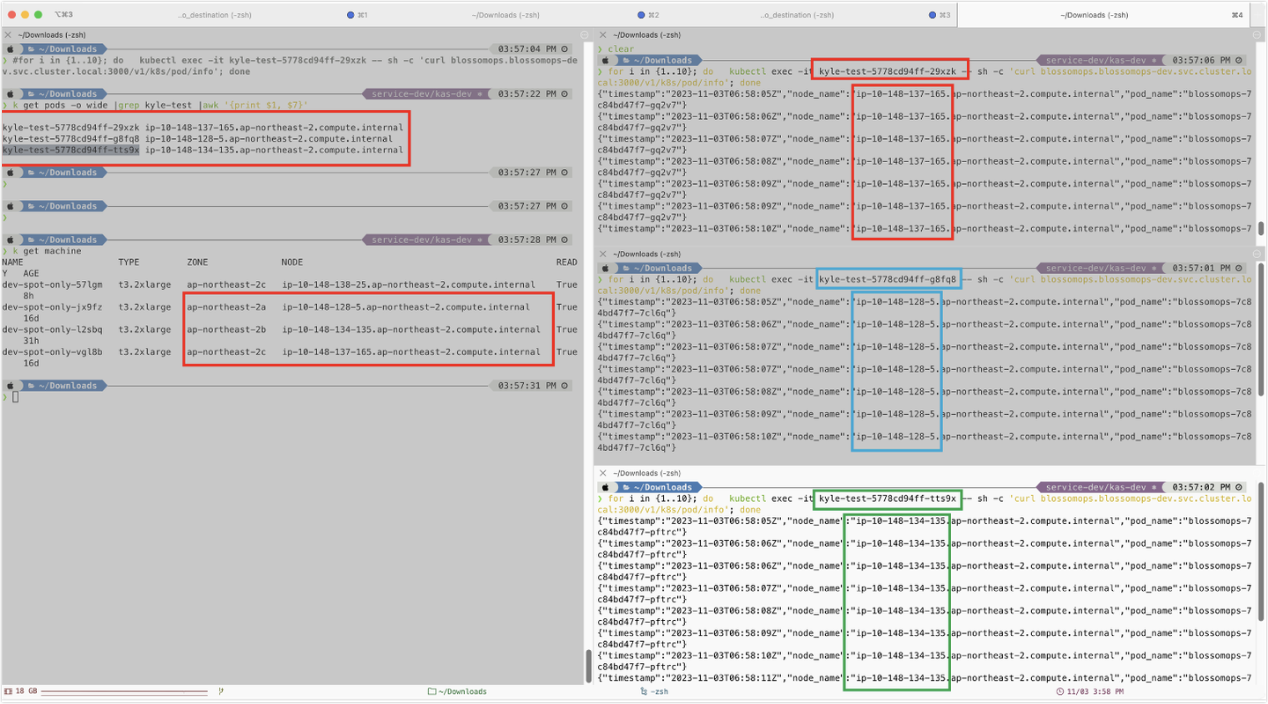아래의 내용을 보면 출발지의 kyle-test는 각 az에 균등 배포가 되고 있다. 그리고 목적지의 서비스 엔드포인트를 호출해보면 모두 동일한 AZ에 위치한 서비스에서 응답이 오는것을 확인할 수 있다.