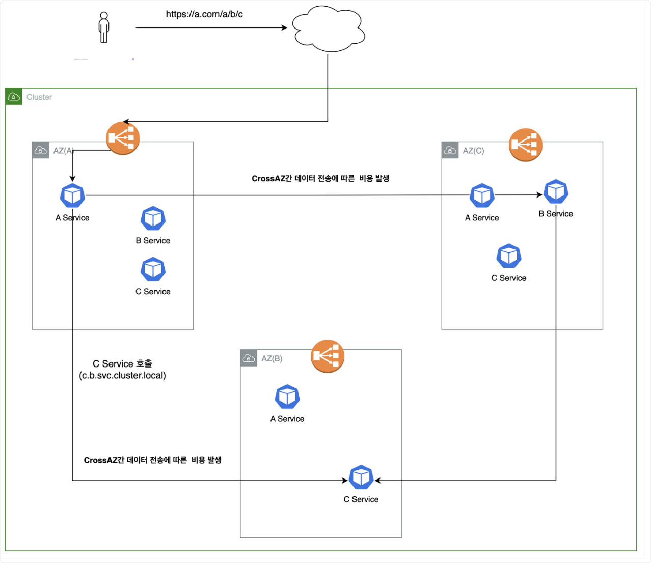 그리고 이때 A -> B -> C Zone에 있는 엔드포인트로 호출하게 되고, 이때 CrossAZ 데이터 전송 비용이 발생하게 된다.