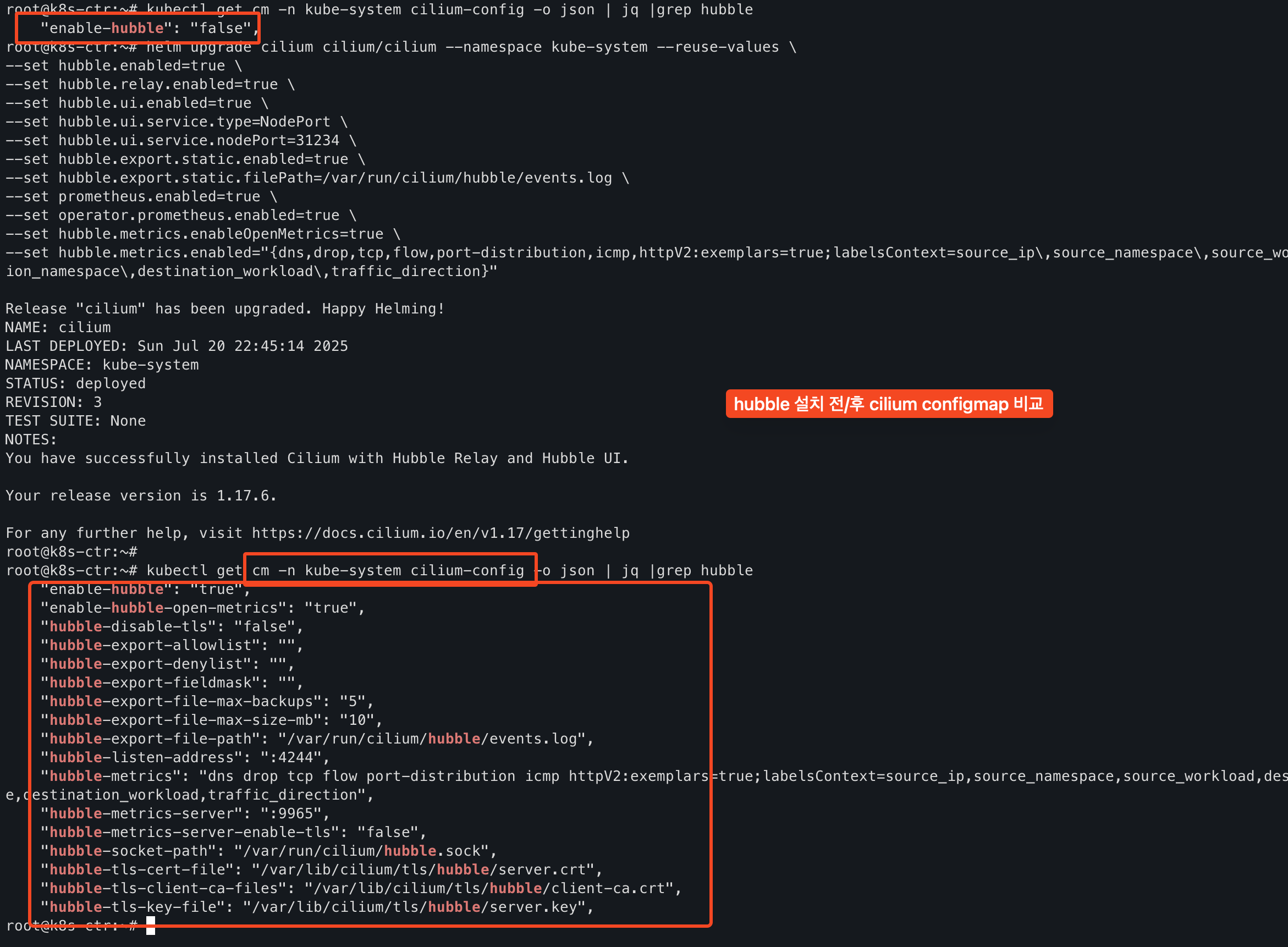 그리고 설치 전/후를 비교해보면 values로 추가한 값이 cilium configmap에 반영된것을 확인할 수 있다.