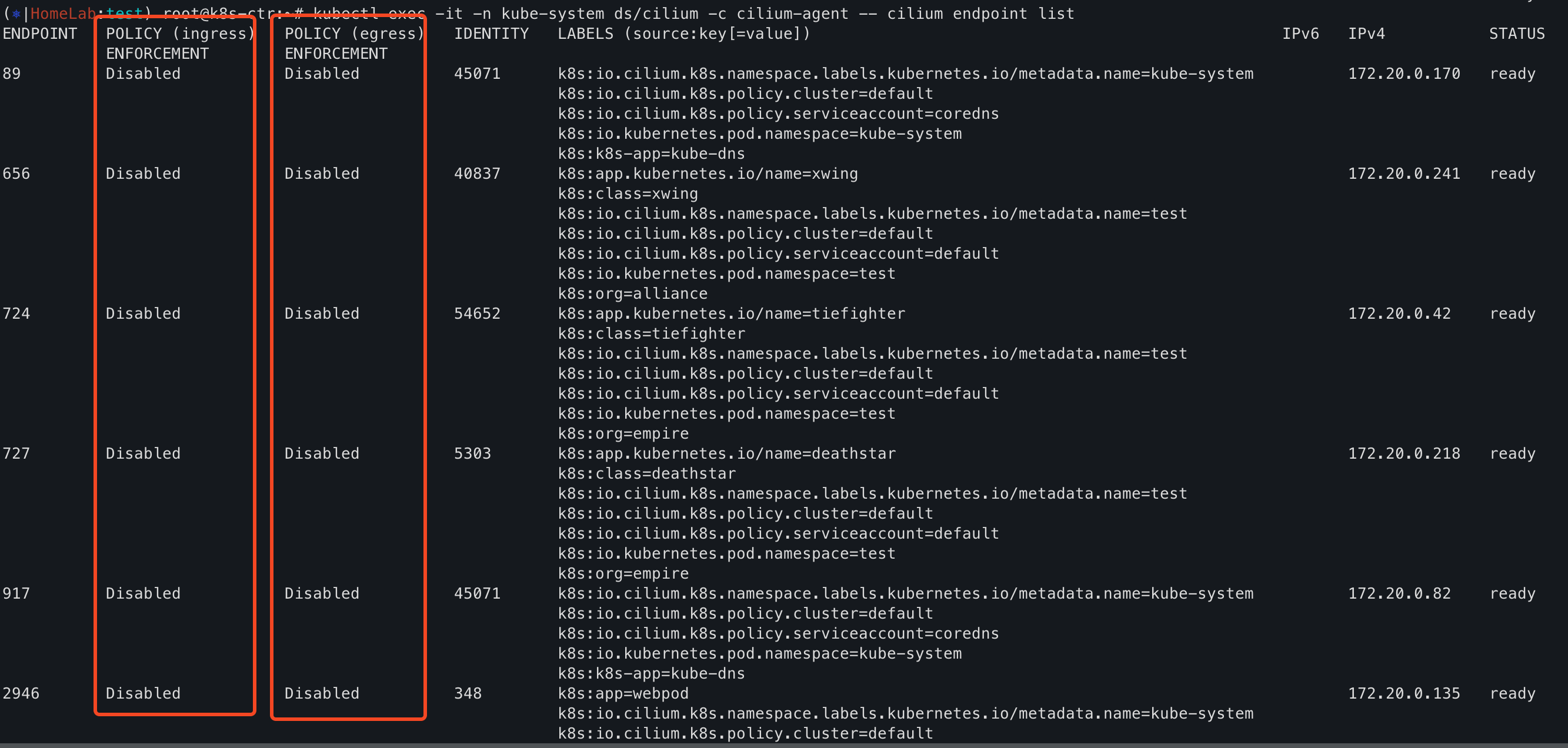 그리고 endpoint list를 확인해보면 기본적으로 POLICY가 모두 Disable로 되어 있어, 별도의 네트워크 제어를 하지 않는다는 뜻이다.