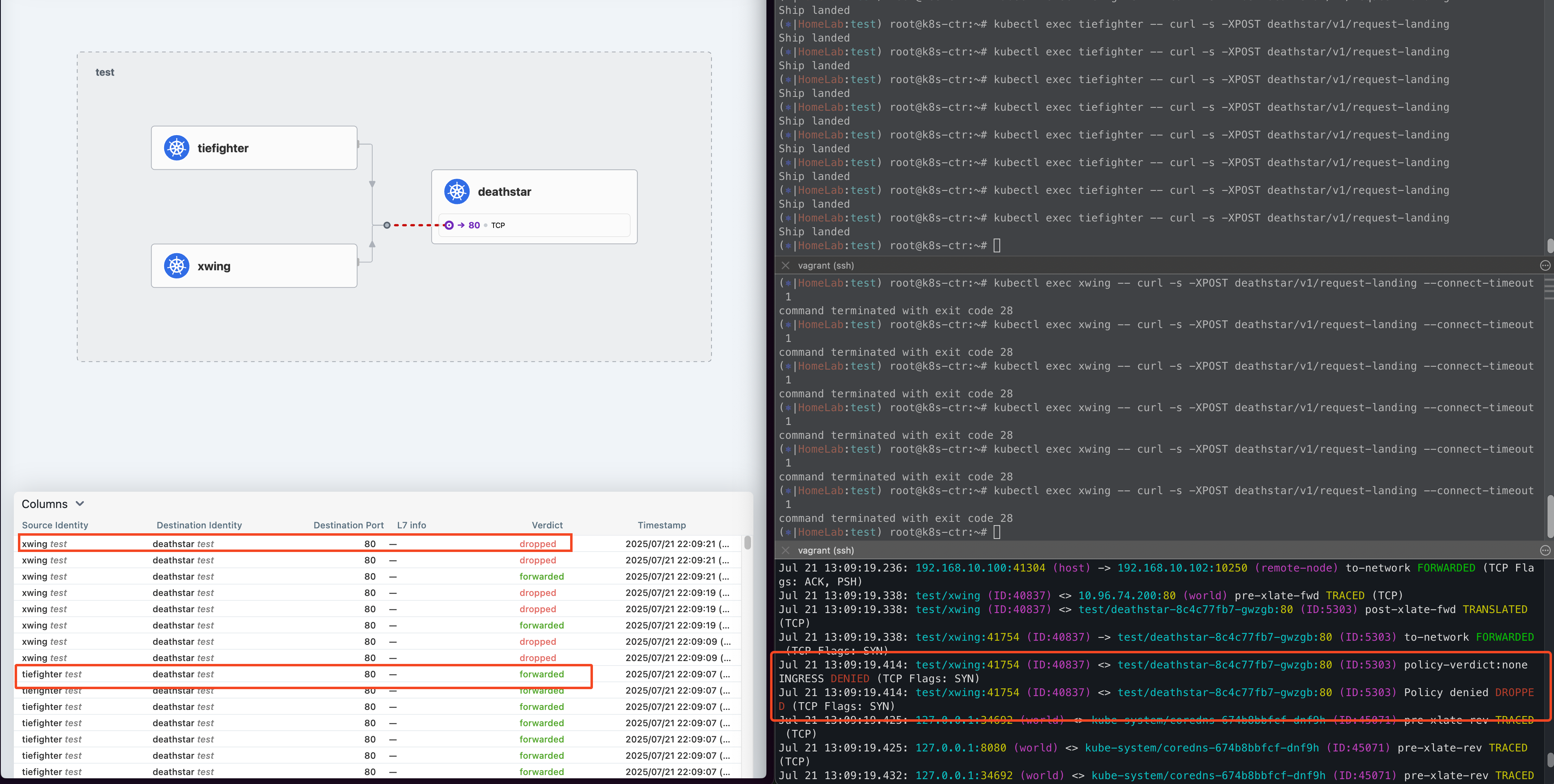 curl로 테스트해보면 위 그림과 같이 xwing에서는 호출이 실패하고, tiefighter에서는 허용되는 모습을 볼 수 있다.