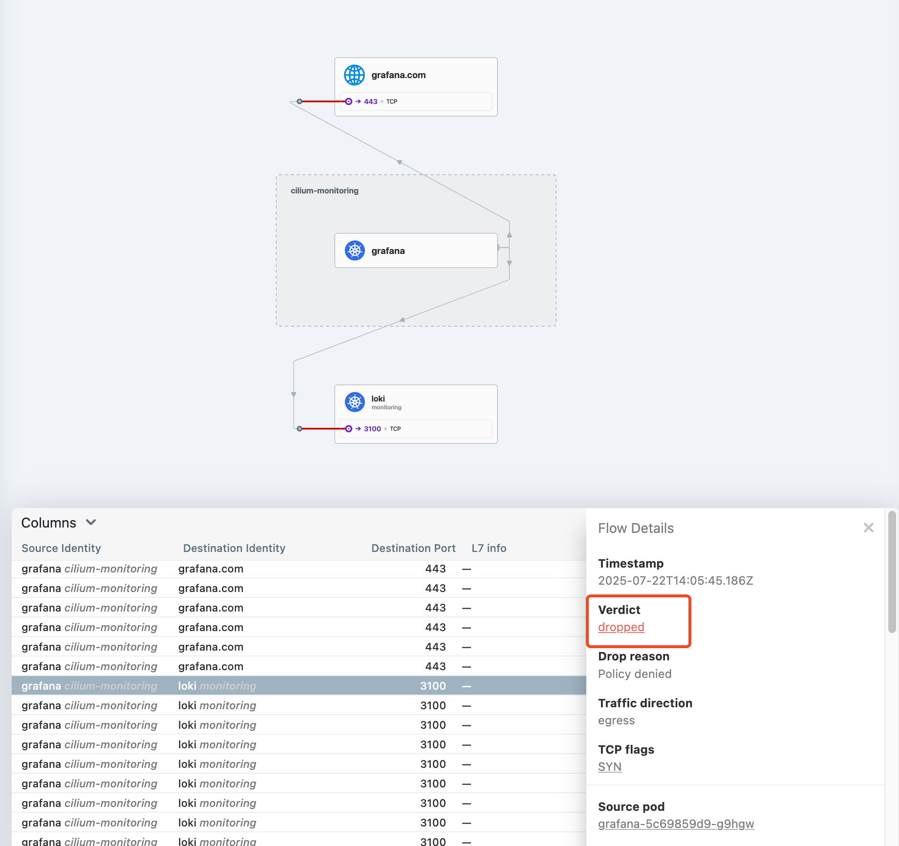 save/test를 해보면, 아래와 같이 loki svc tcp 3100으로 요청이 발생하는것을 볼 수 있다.