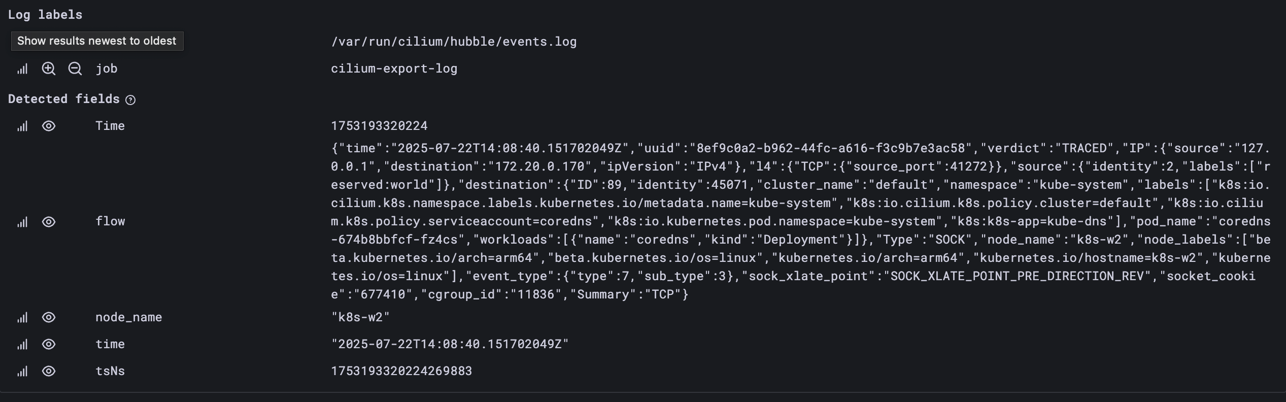 grafana에서 loki를 datasource로 잡았다면, 상단에서 loki로 변경한 다음에 Run Query를 하면 hubble export log를 이제 grafana에서 쉽게 볼 수 있다.