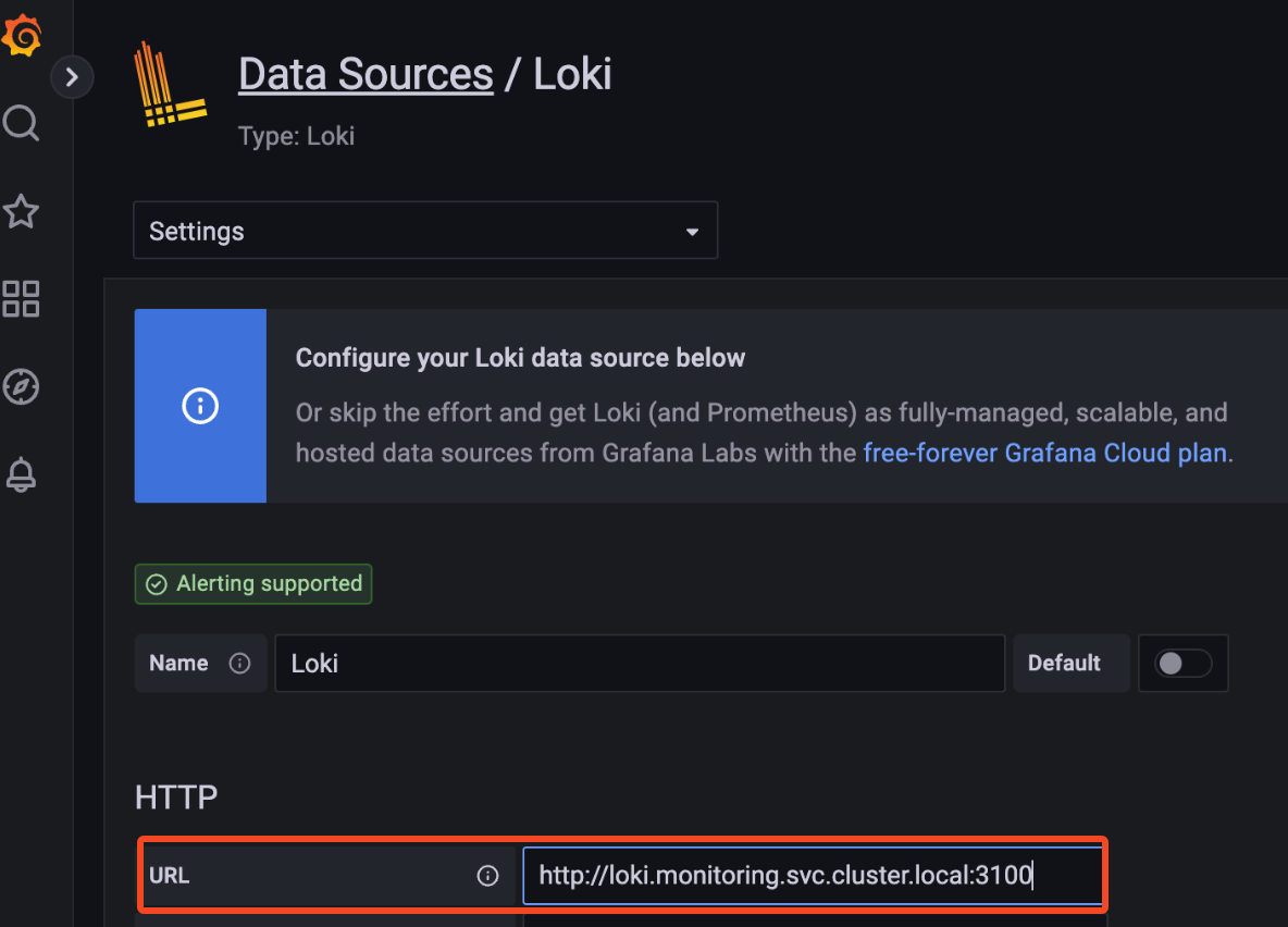 Datasource는 loki svc의 주소를 기재하면 된다. loki가 다른 namespace에 있기 때문에 namespace까지 다 적어주었고,