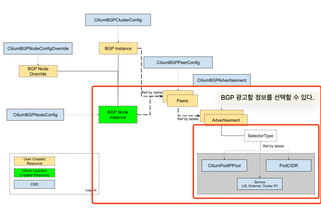 - CiliumBGPAdvertisement : 어떤 객체를 BGP 광고할지 선택하게 된다. PodCIDR or Service IP 등등