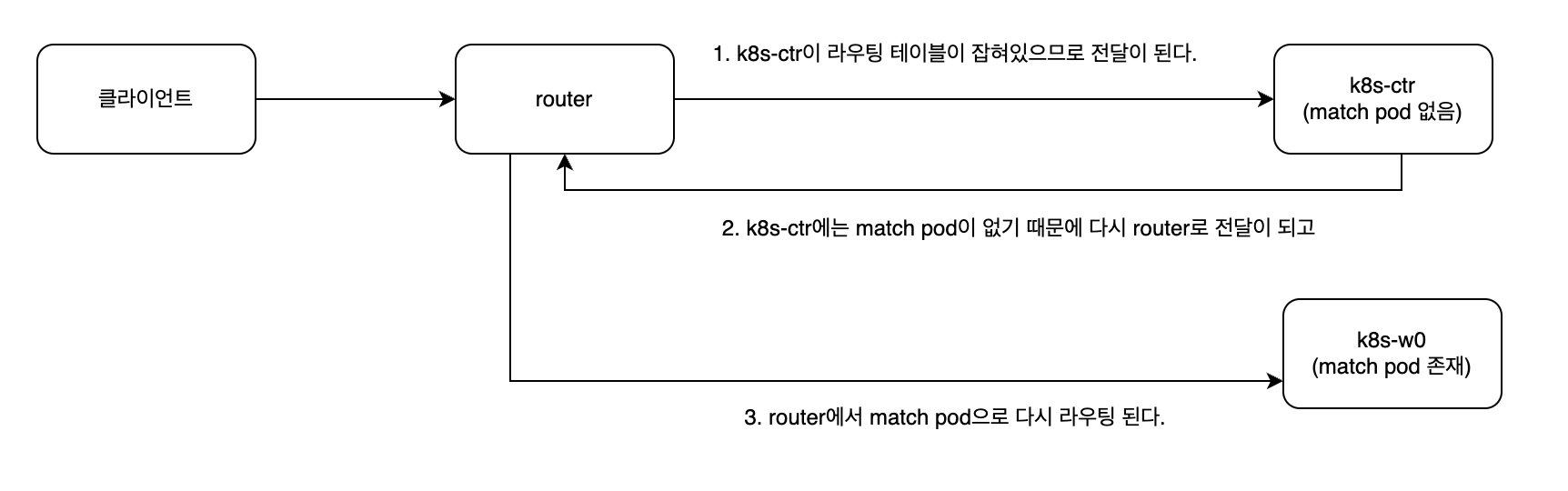 router에는 match pod이 없는 k8s-ctr로 라우팅 테이블이 되어 있기 때문에, 해당 노드로 전달을 하지만