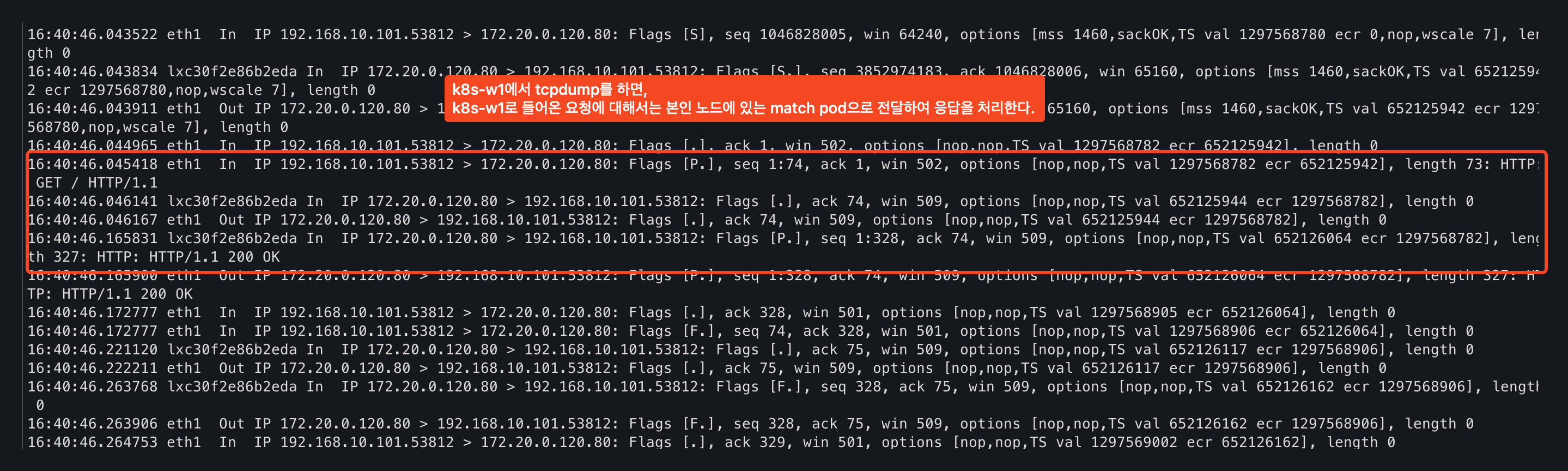 17:07:32.119131 eth1 Out IP k8s-ctr.37916 > 172.20.1.121.http: Flags [.], ack 1, win 502, options [nop,nop,TS val 2890472426 ecr 3819390684], length 0