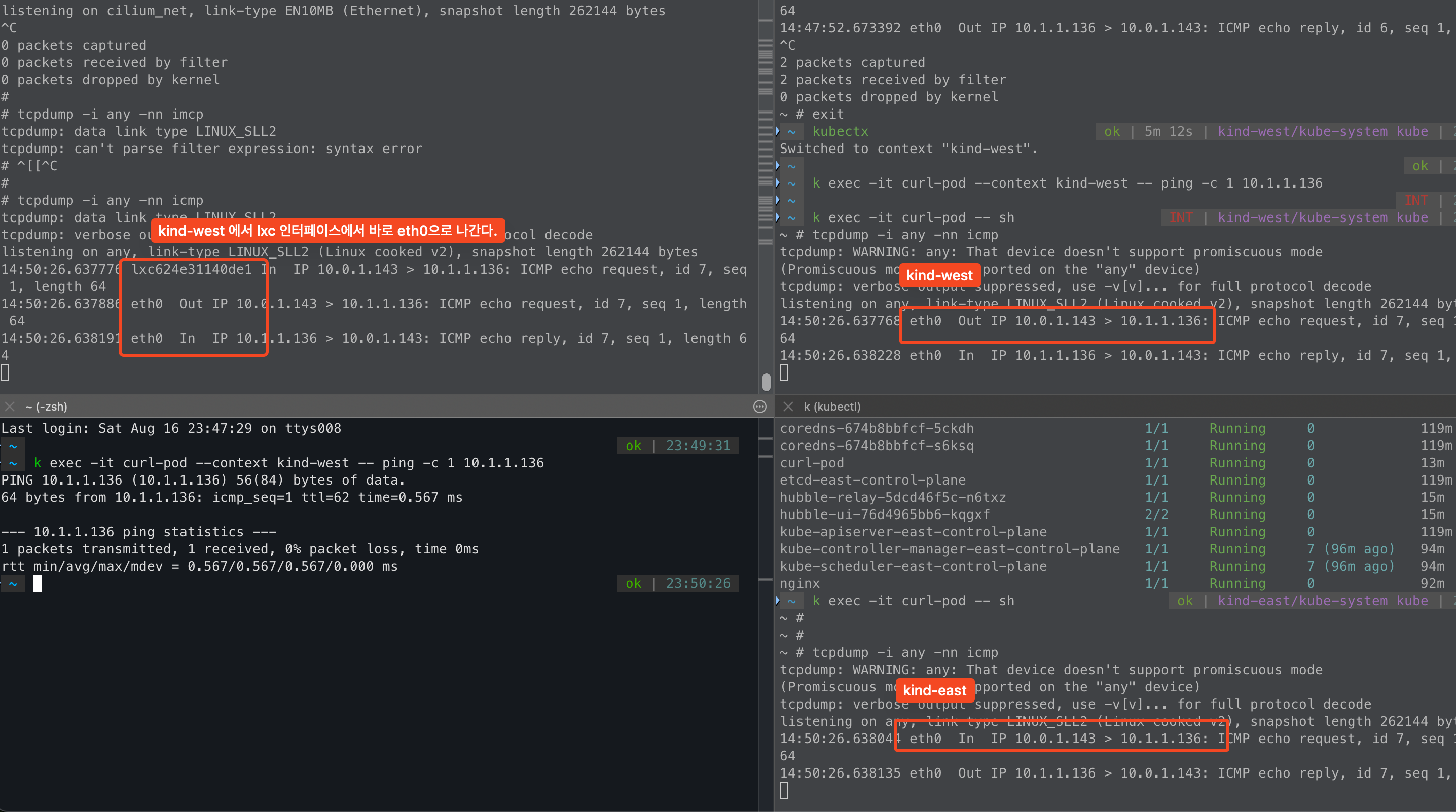 west -> east curl-pod로 icmp를 날려보면, east cluster에서 NAT 없이 통신이 되는걸 확인할 수 있다.