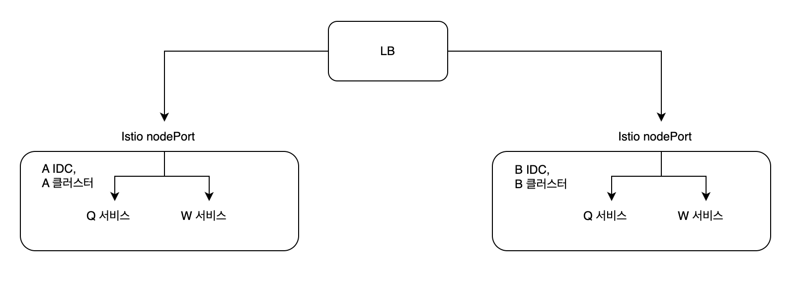 그렇기 때문에 A 클러스터에서 Q 서비스가 W 서비스를 호출할 때 다시 LB를 거치게 되고, 이때 50%는 다른 B 클러스터로 전달이 된다.