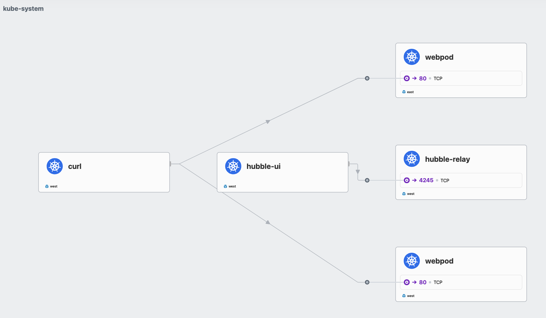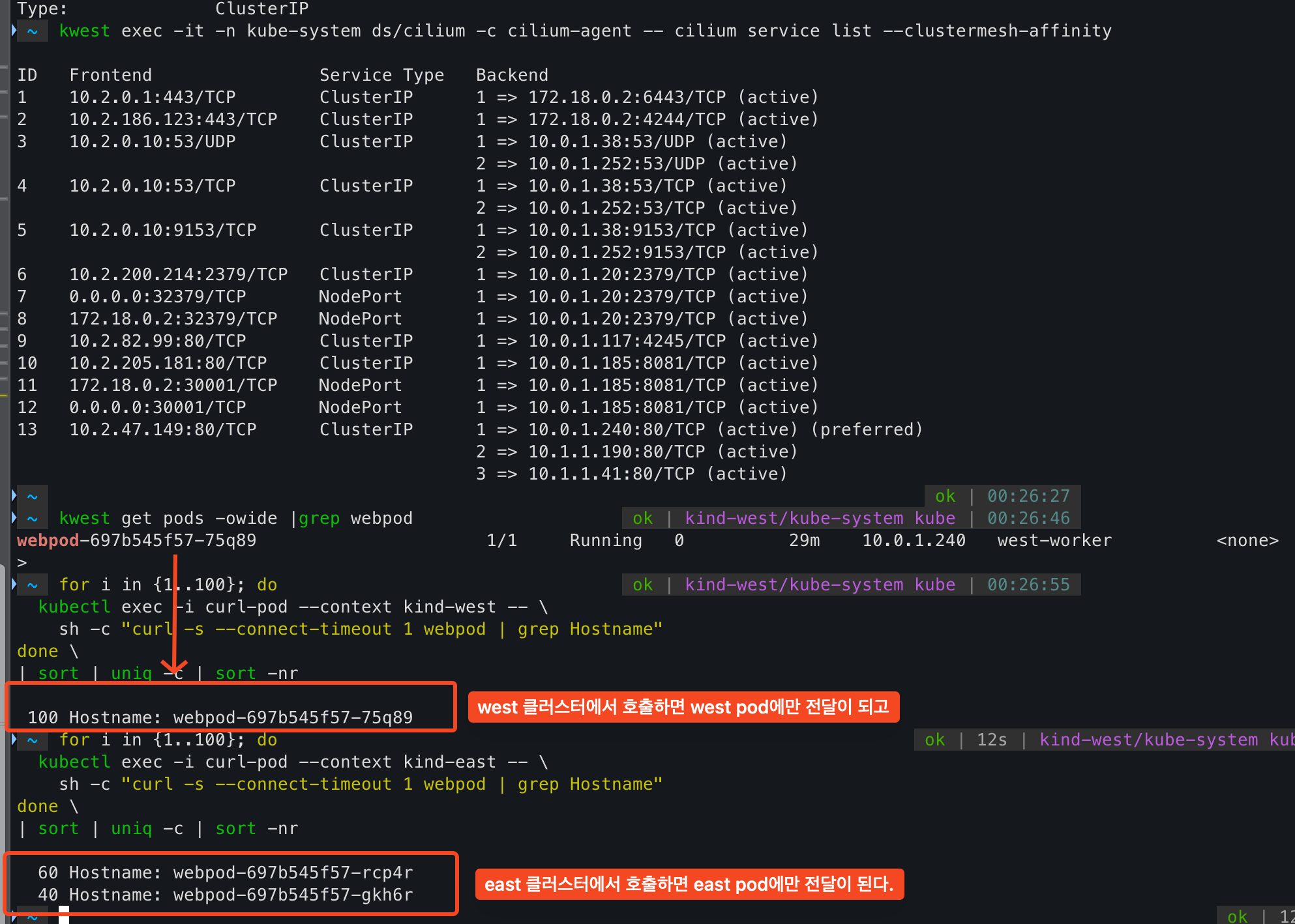 kubectl exec -i curl-pod --context kind-west -- sh -c "curl -s --connect-timeout 1 webpod | grep Hostname" done | sort | uniq -c | sort -nr