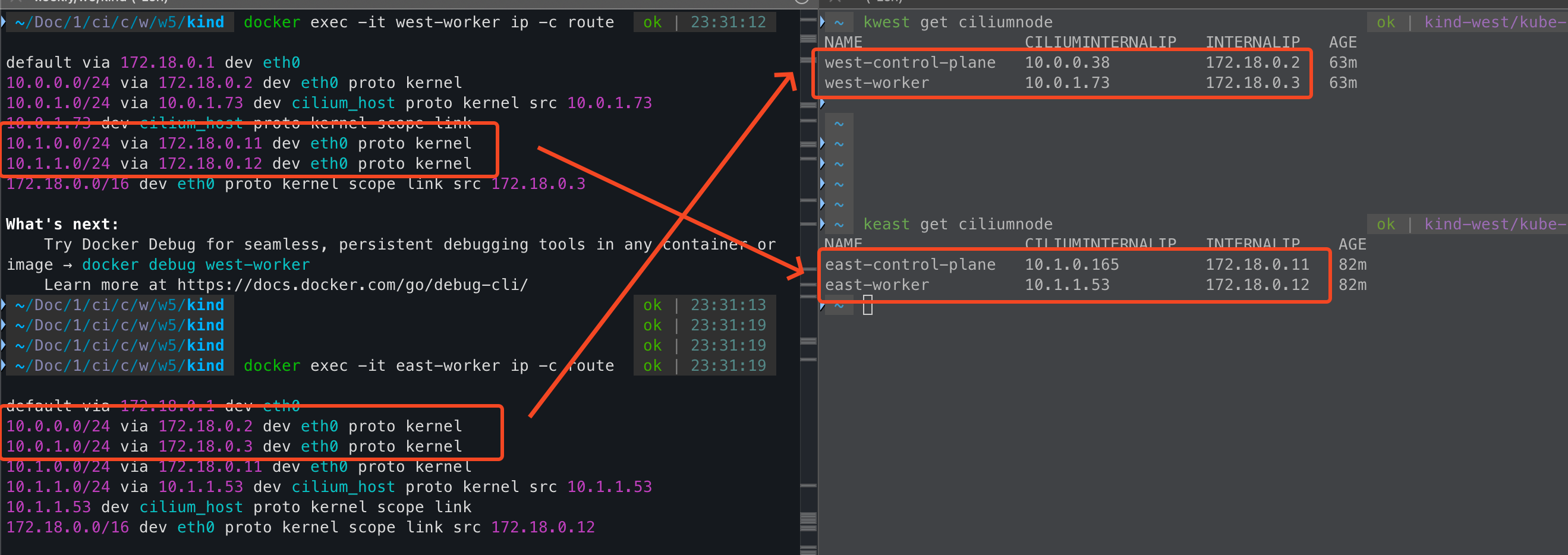 - 그래서 배포하고 난 다음에 west 노드에서 라우팅 테이블을 보면 본인 클러스터에 대한 podCIDR만 커널 라우팅이 잡혀있다.