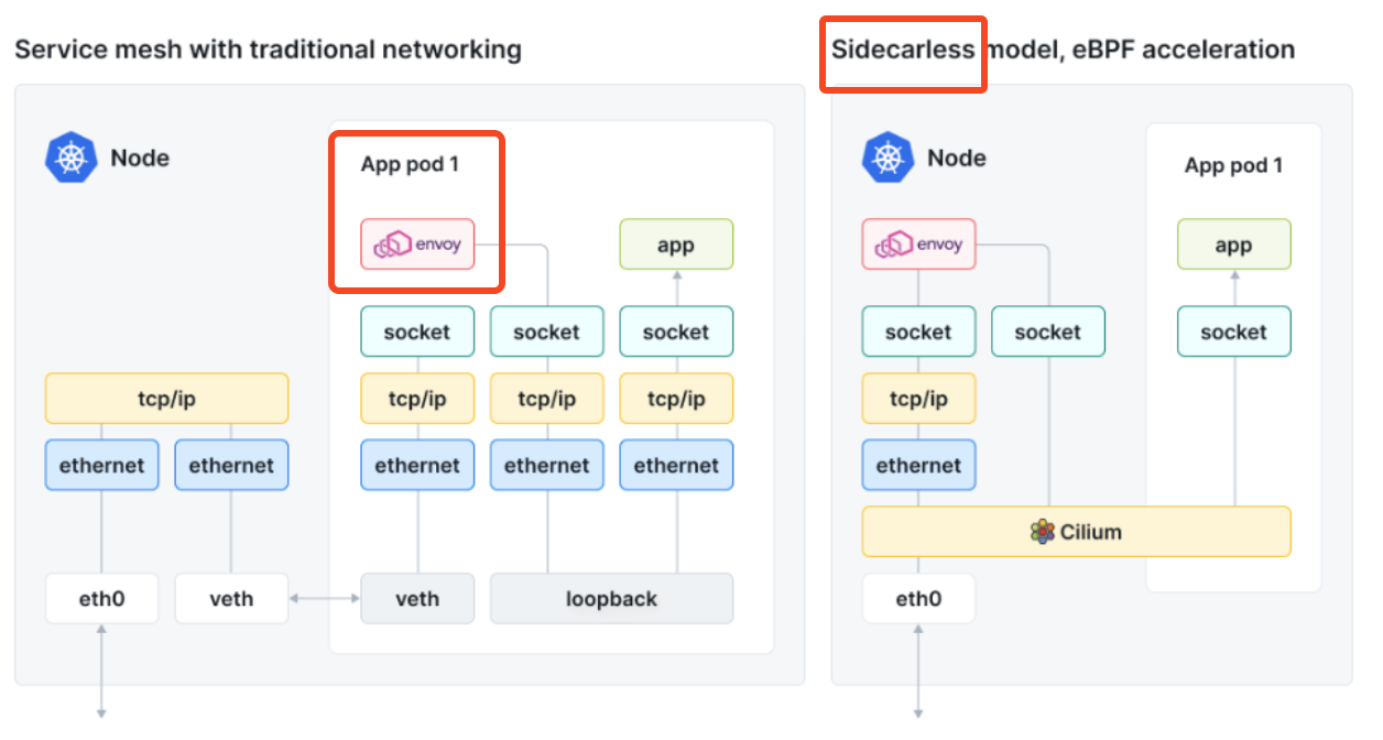 istio와 다른점은 pod sidecar가 없다는 것이 가장 핵심이다. cilium이기 때문에 eBPF로 커널에서 트래픽을 제어할 수 있다.