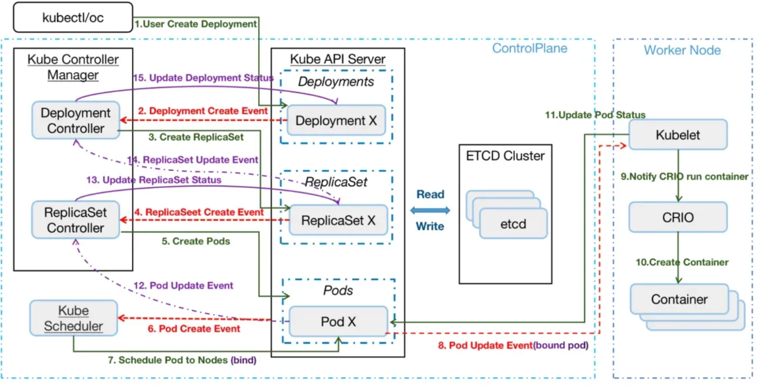 그리고 controller-manager, scheduler한테 변경 이벤트를 주고, 최종적으로는 kubelet이 pod을 생성하고 다시 etcd에 저장한다.