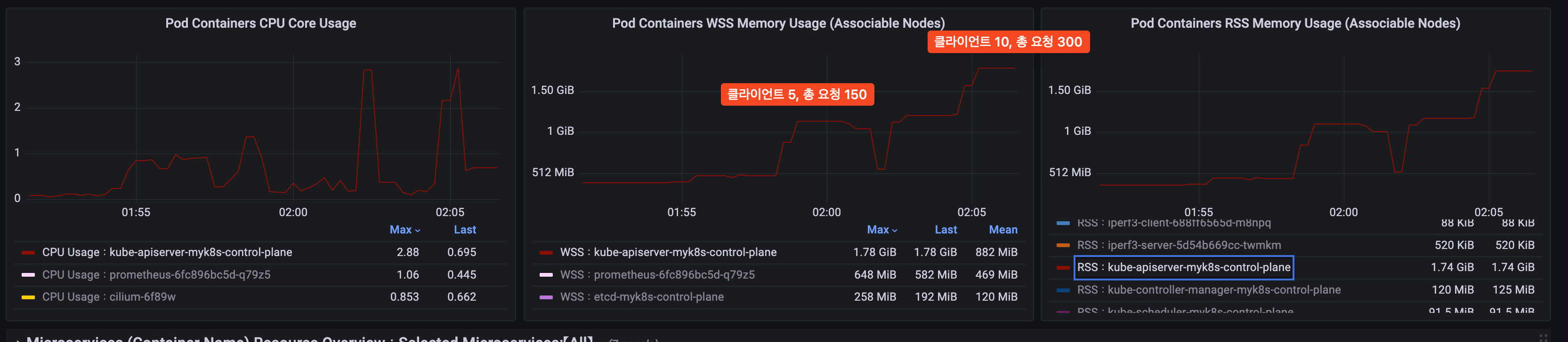 테스트를 해보면 pod 개수 및 요청 개수 자체도 많은 편이 아니나 kube-apiservers는 1 ~ 1.8gib까지 점유하고 있다.
