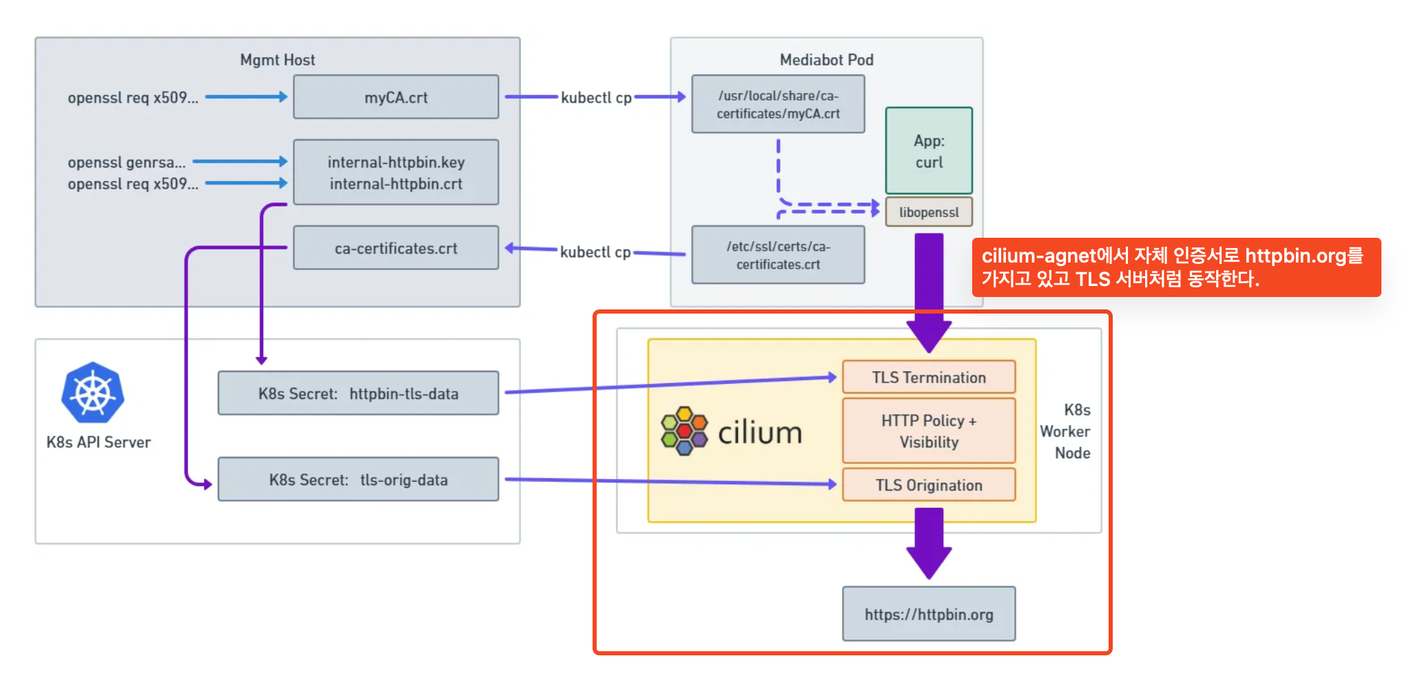 cilium에서 다시 origin tls를 설정하고, server와 통신할 때 pod에서 복사해서 생성한 tls-origi-data secrets을 사용하는것이다.