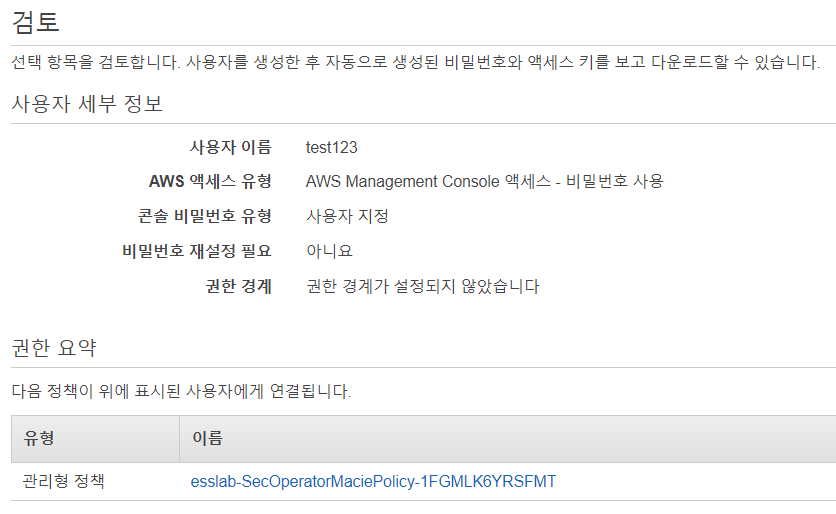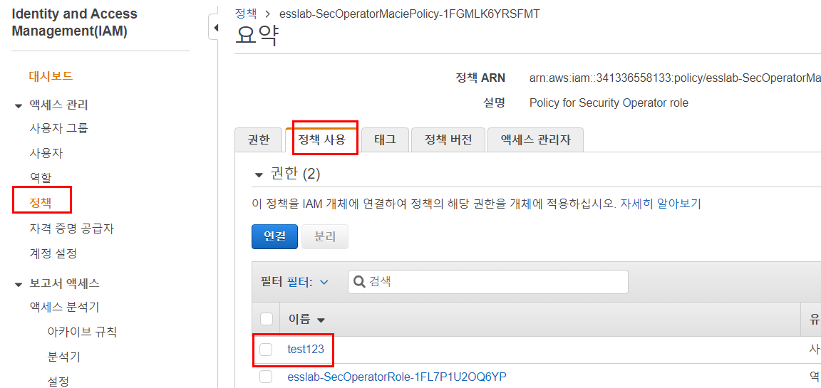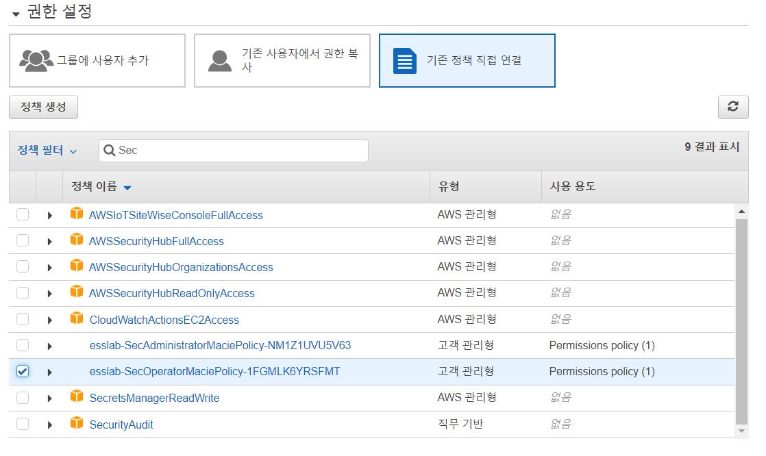 - 나는 AWSSecworkshop으로 CloudFormation으로 생선한 'esslab' 정책이 있으므로 해당 정책을 연결했다.
