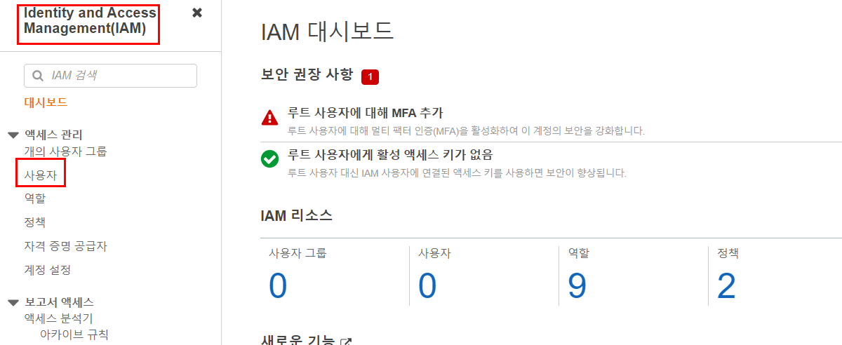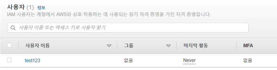 계정 생성 이후 IAM > 사용자를 선택해보면 사용자 계정이 만들어졌음을 알 수 있고,