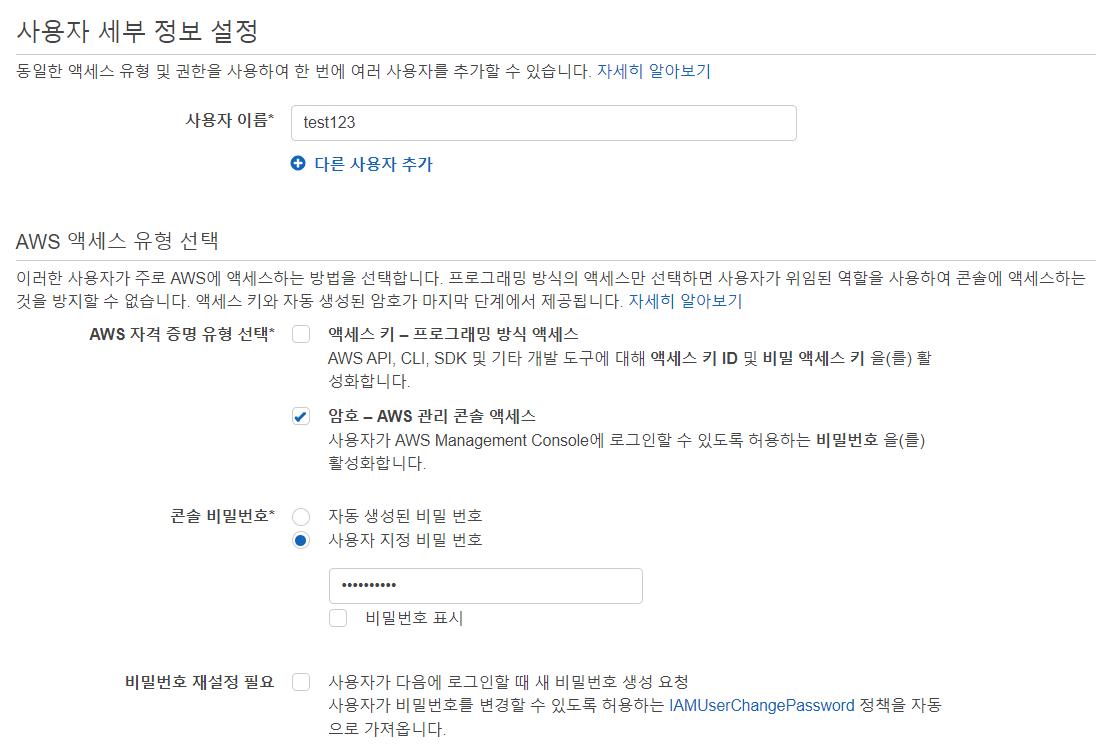 - 'AWS 관리 콘솔 액세스'를 쉽게 말하면 ID/PW를 지정하여 PW로 로그인하는 것을 뜻한다.
