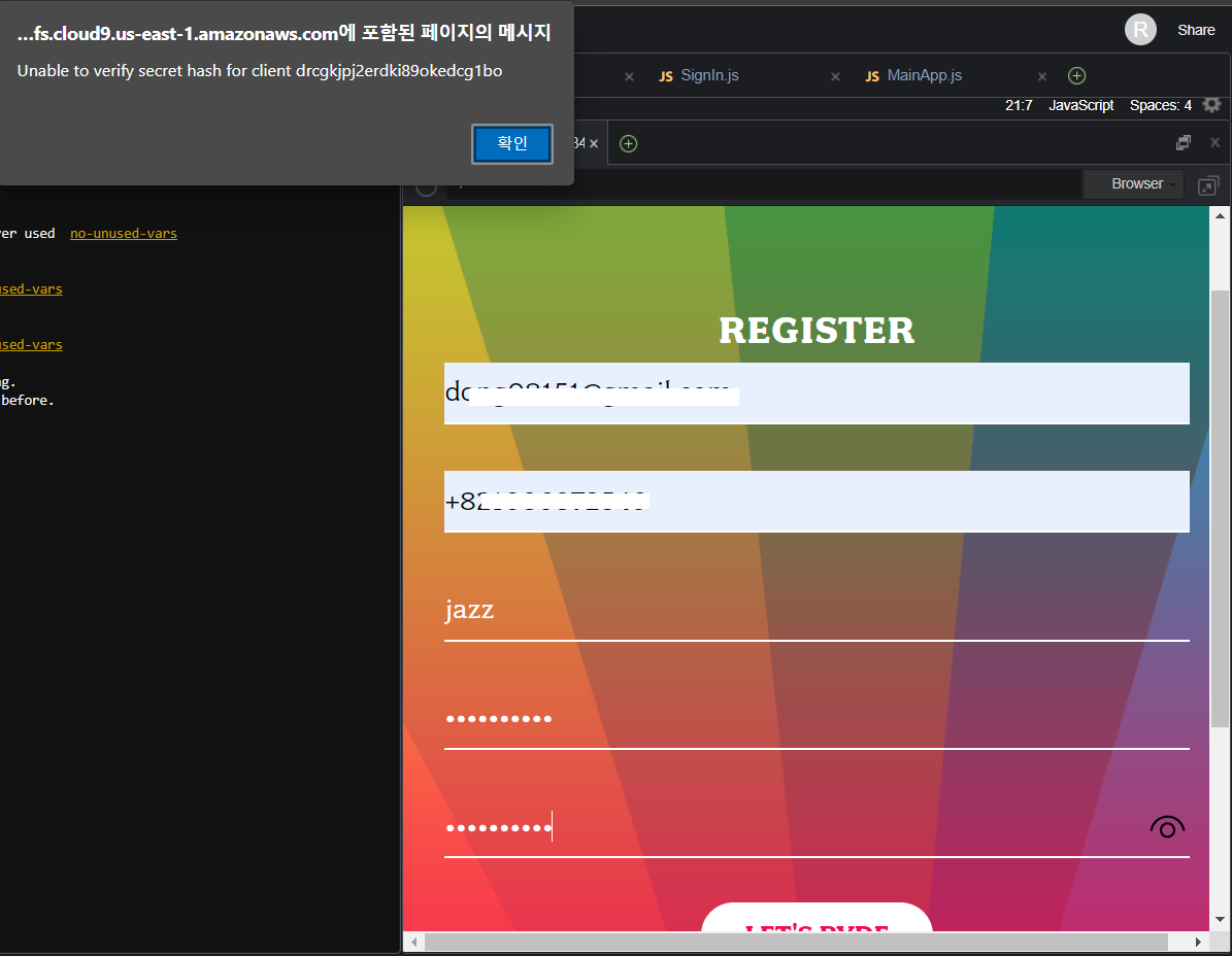 - 원래 정상적인 경우라면, 회원가입 후 회원가입 정보가 Cognito 사용자 Pool에 정보가 넘어가야 하지만,