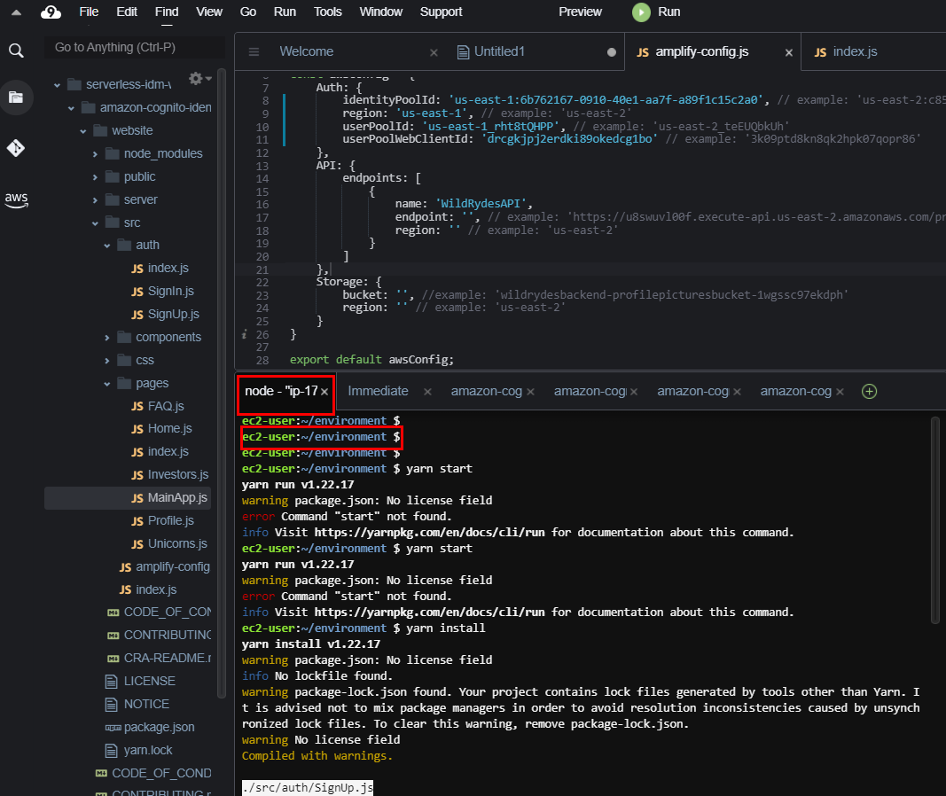 | git clone https://github.com/aws-samples/amazon-cognito-identity-management-workshop.git >> AWS 실습을 위한 Git 정보를 다운로드 한다. npm install -g yarn >> yarn 패키지를 설치한다. yarn 패키지는 npm과 유사하게 패키지를 설치하는 자바스크립트이다. >> npm을 써도 무방하나, npm이 비해 가볍고 순차적으로 설치하는 npm을 대체하기 위해 개발된 패키지라고 보면 된다. cd ~/environment/amazon-cognito-identity-management-workshop/website/ >> Git 정보가 있는 디렉토리로 이동한다. yarn install >> GIt에서 받은 패키지를 설치하고 yarn start >> 설치한 패키지를 실행한다. |