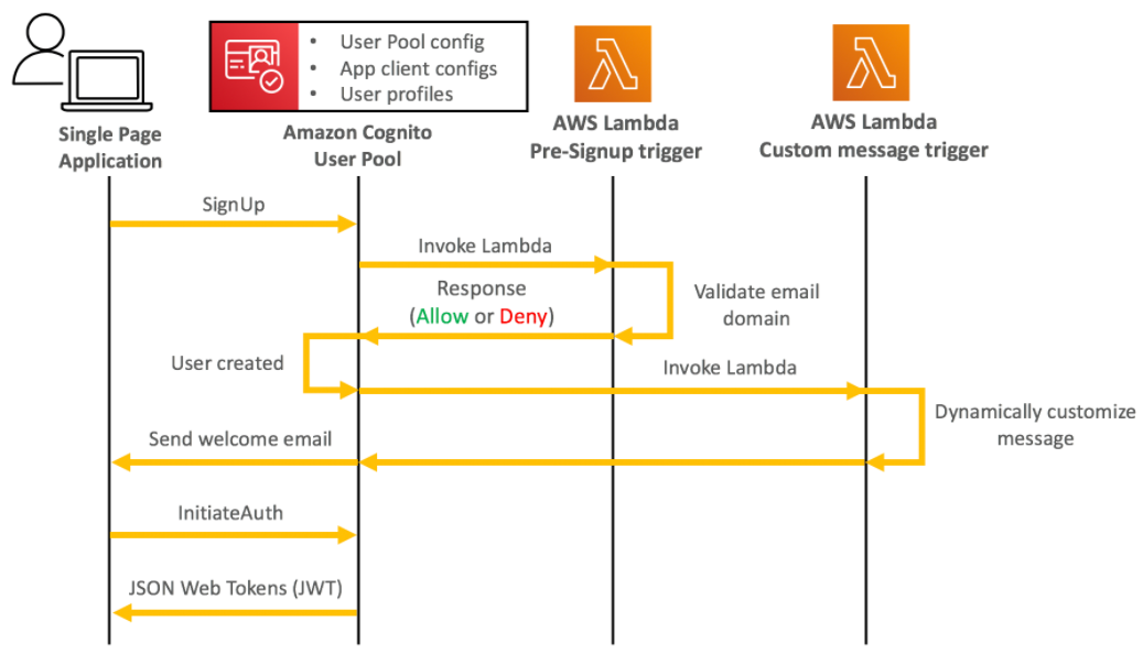 사용자가 SignUp하면 Cognito 서비스에서 특정 이벤트를 트리거삼아 특정 Lambda를 호출하고 그 결과를 Cognito 서비스가 받아 회원가입 승인 또는 불허한다.