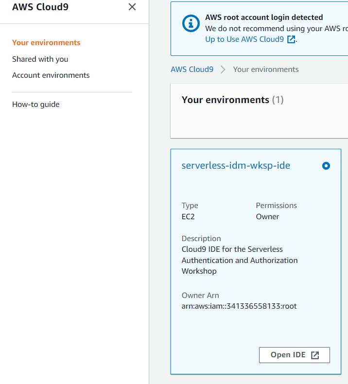 - Stack 생성 후, 커피 한잔 마시고 Cloud9 서비스에 들어가면 아래와 같은 IDE 환경이 하나 생성되어 있다.