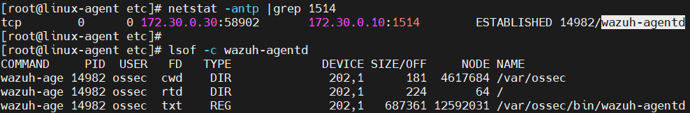 실제로 Wazuh Agent를 연결하는 프로세스의 lsof 결과를 보면, /var/ossec를 참조하고 있음을 알 수 있다.