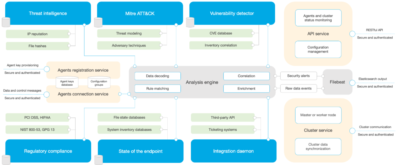 로그 데이터 분석, 악성코드 탐지/침입 방지, 파일 무결성 모니터링, 취약점 진단/규정 준수와 같은 다양한 기능을 제공한다.