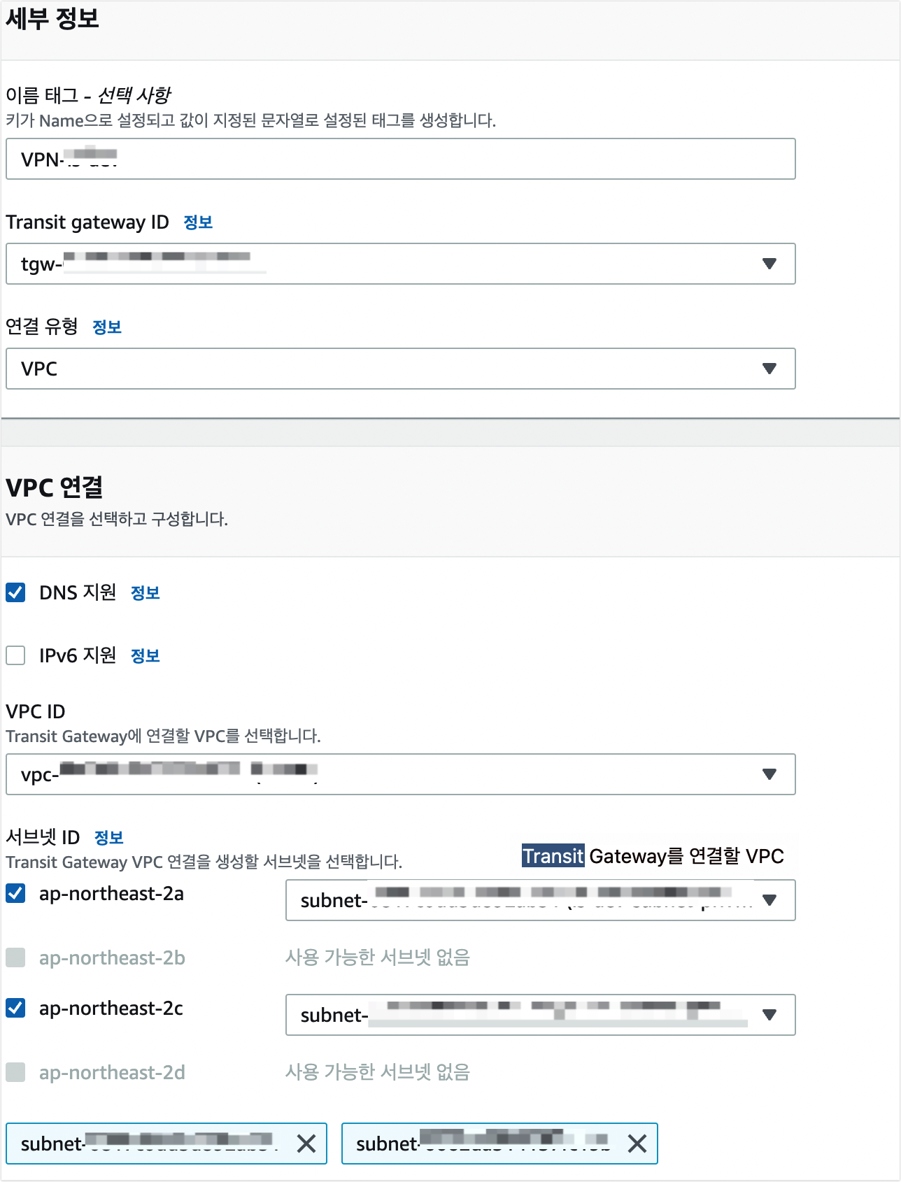 Transit Gateway를 생성한 다음에 내가 연결한 VPC만 지정해주면 된다.