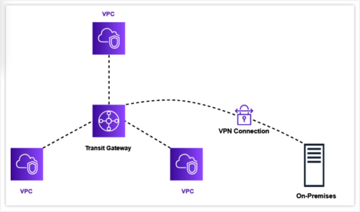 위는 Transit Gateway의 기본 개념도이다. VPC Peering과 비교해보면 구성도가 매우 간단해짐을 알 수 있다.
