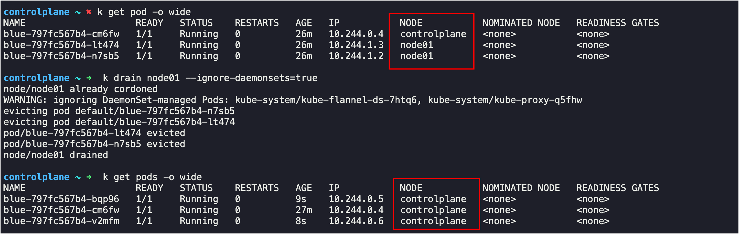 - 그런 다음 현재 node01에 배포되어 있는 pod에 대해서 eviction을 해야한다.