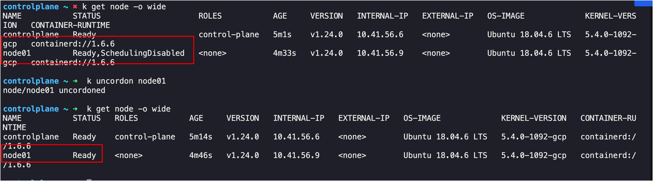 node01 Ready,SchedulingDisabled <none> 38m v1.24.0 10.37.81.6 <none> Ubuntu 18.04.6 LTS 5.4.0-1092-gcp containerd://1.6.6